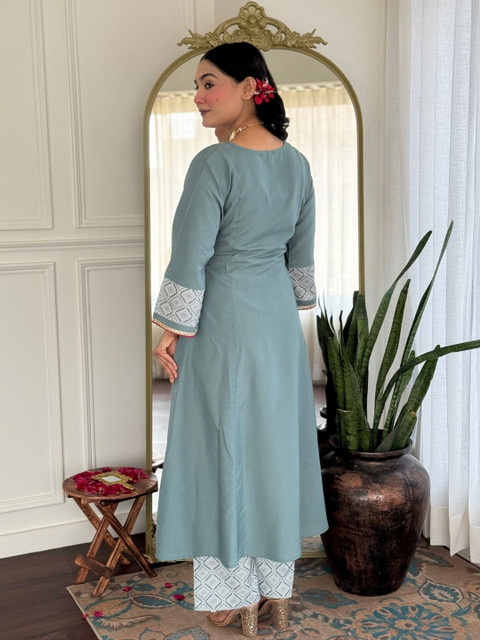 Pair this kurta set with nude or tan block heels / flat sandals for a graceful everyday look. Silver oxidised jewelery or minimal pearl necklace will complement the neckline beautifully. Hair is styled in a centre-part low bun or soft curls for an elegant tabby-style appearance. All the accessories shown are for styling purposes only. Slight color variation may occur due to photographic reasons.