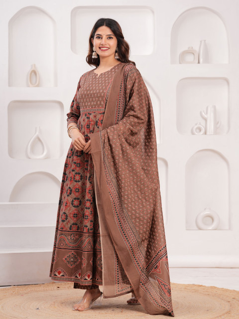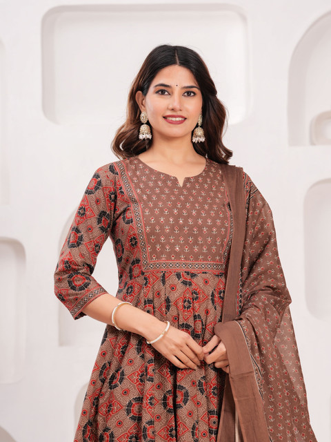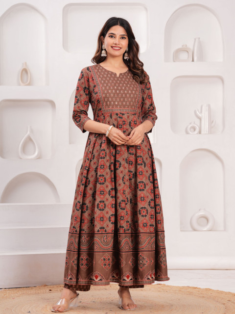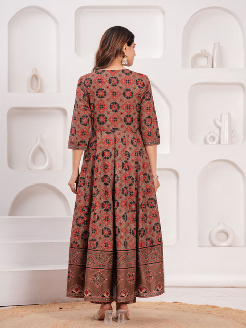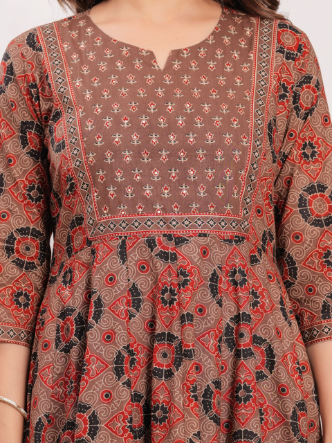 This dress has a lovely traditional and elegant vibe. The mustard yellow color with green prints gives it a vibrant yet earthy look, perfect for festive or casual gatherings. The mix of patterns on the yoke, sleeves, and hem adds visual interest without looking overwhelming. The flared silhouette is flattering and comfortable, while the three-quarter sleeves balance style with practicality.