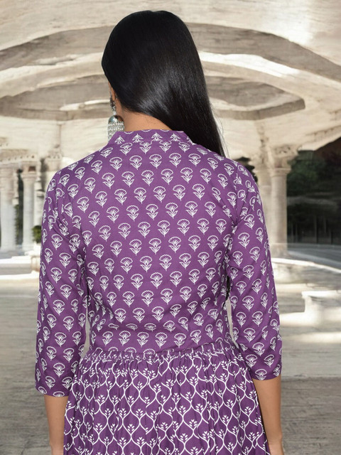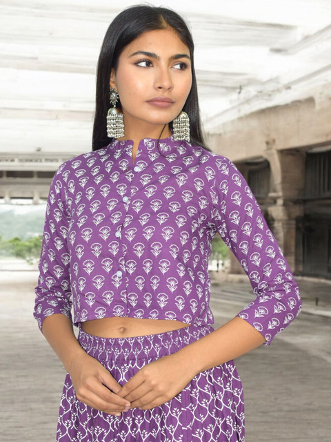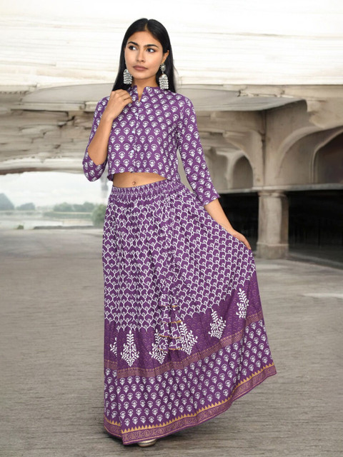 Purple printed ready to wear blouse, has a mandarin collar, three-quarter sleeves, purple printed ready to wear lehenga, flared hem