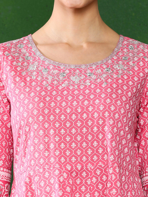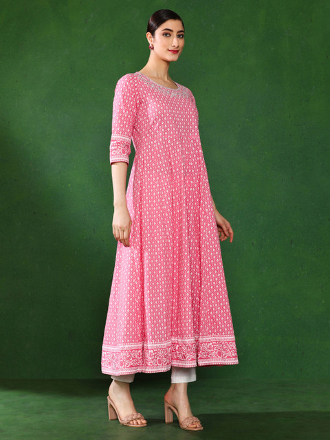 - Pink Printed Anarkali in Cotton Fabric Comes with White Khadi Print Embroidery on The Yoke