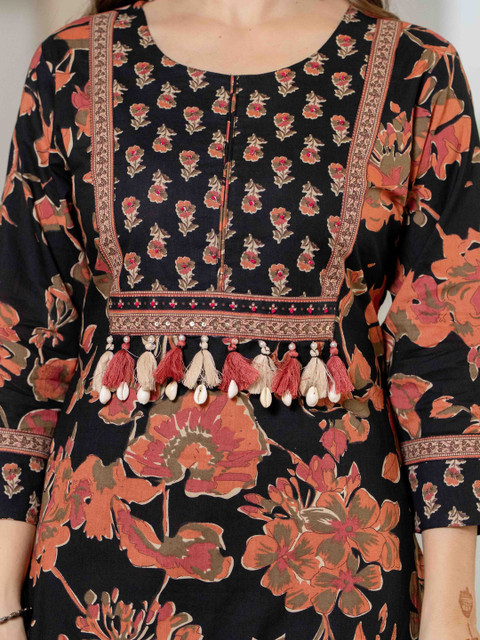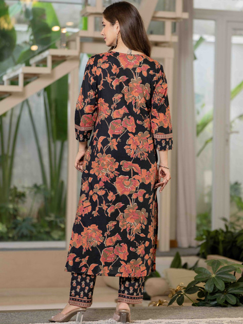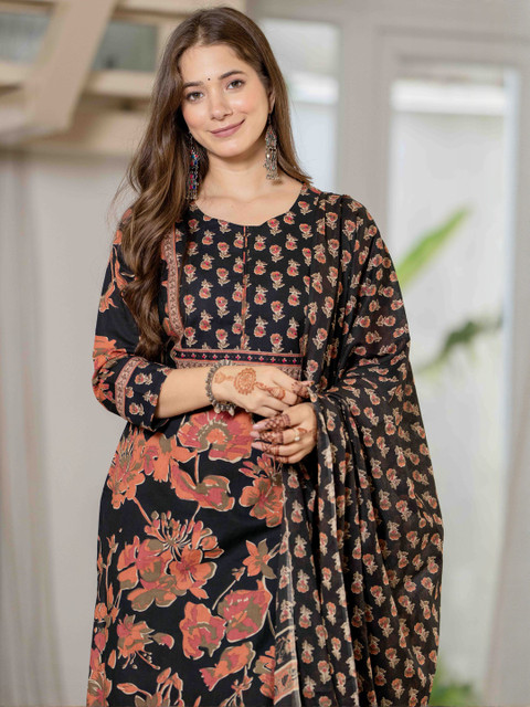 Pure Cotton Printed Kurta Set with Pant & Dupatta Straight CalfLength, 3/4 Sleeve, V- Neck Elegant Ethnic Attire, Work – Handwork on Neck , Floral Print