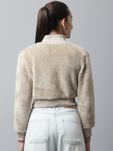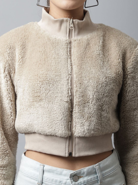 Beige self design solid lightweight tailored jacket with faux fur trim, has a stand collar, na pockets ,has a zip closure, long sleeves, straight hemline, polyester lining