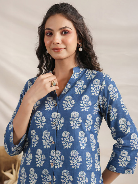 White & Blue Floral Printed Tunic, has a Mandarin Collar and three quarter sleeves, Secured with button closure