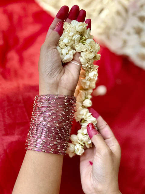 Set of 12 lavender-colored thin glass bangles, each has gold artificial stone studded details, secured with slip-on closure