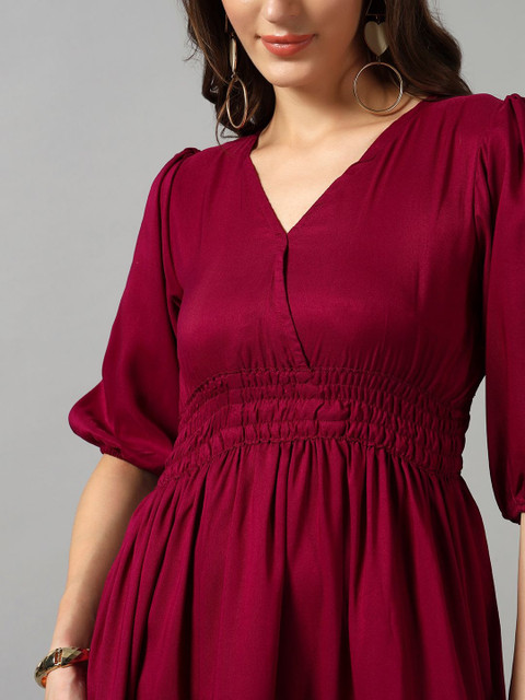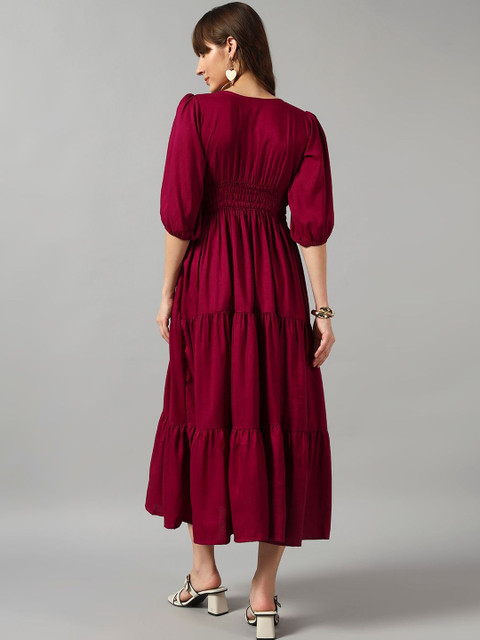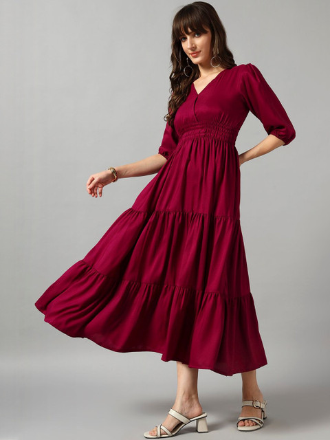 This modern dress comes in Printed long tier dress comes with crossed v neckline and smocking detail at the waist line. The maxi dresses for women western wear has fine gathers on the shoulder which gives it an appeal. This beautiful dress can be worn with a belt to make a more stylish look. It is crafted from polyester fabric.It is a western dresses for women latest design party.