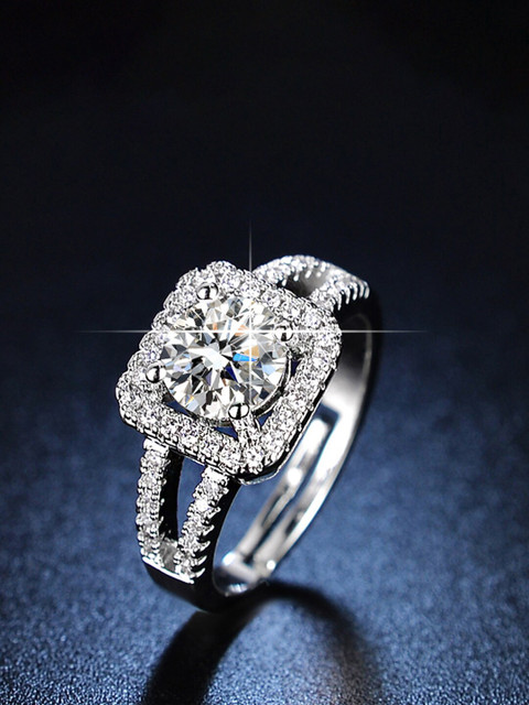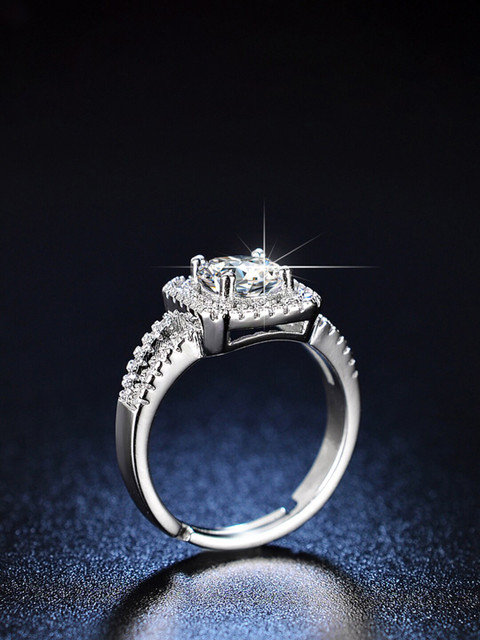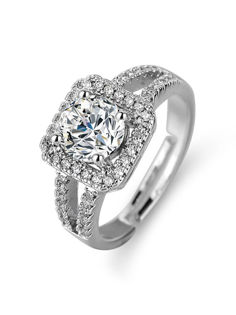 Silver-plated adjustable finger ring, has white AD-studded and Anti Tarnish details