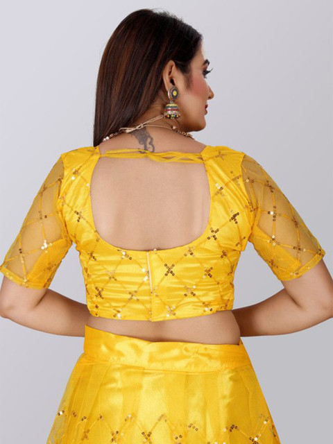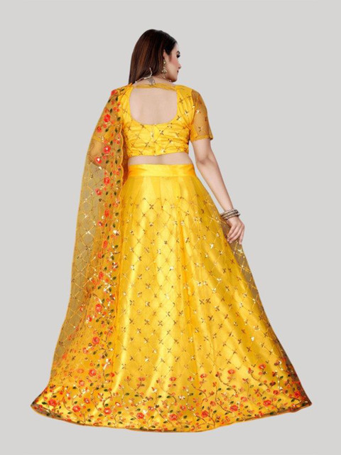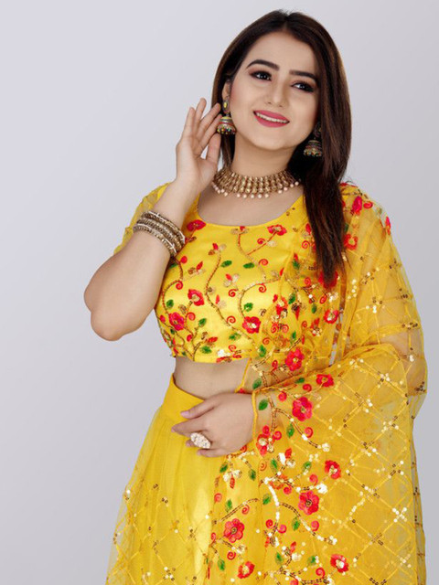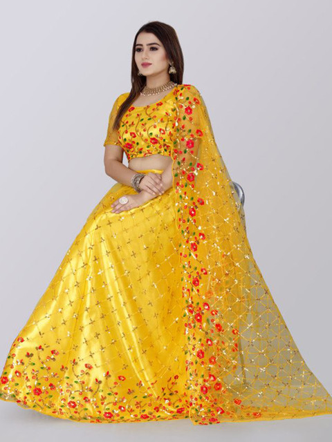 Yellow and red embroidered semi-stitched lehenga, flared hem