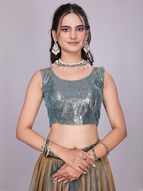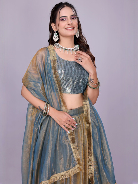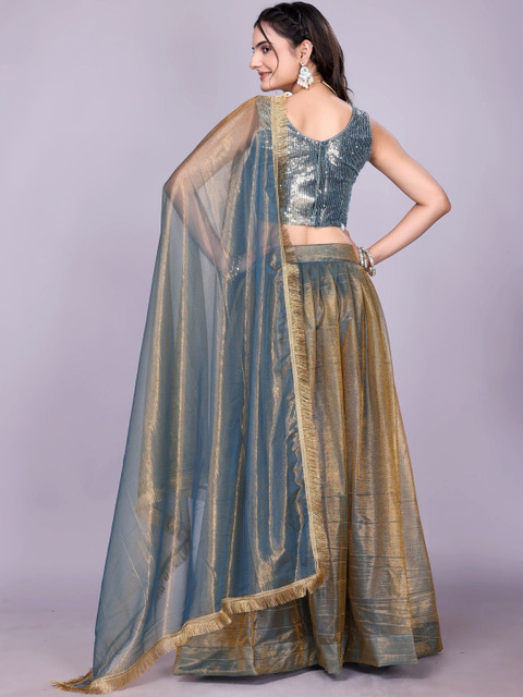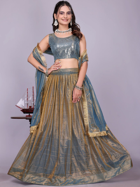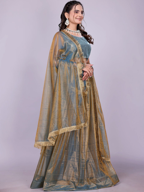 Blue and gold-toned embroidered unstitched blouse, has a round neck, sleeveless, blue and gold-toned embellished semi-stitched lehenga, flared hem