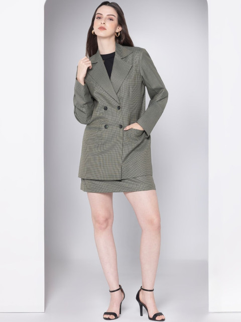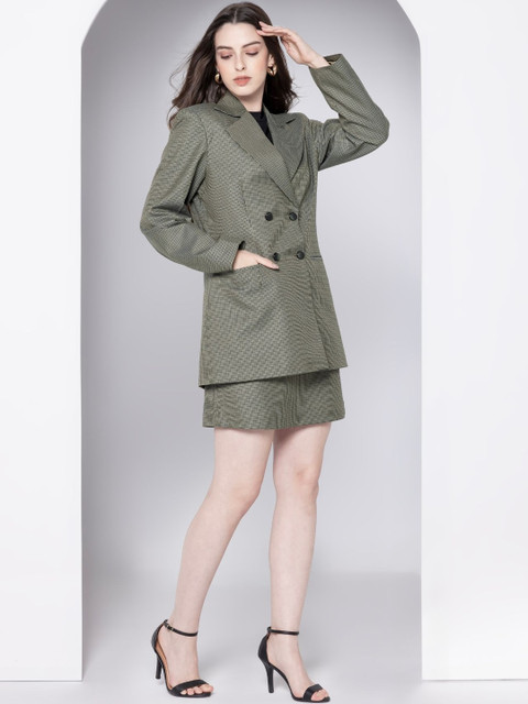 Olive-green striped regular-fit party blazer, has a notched lapel, long sleeves, double-breasted with button closure, 2 welt pocket and a single-vented back hem