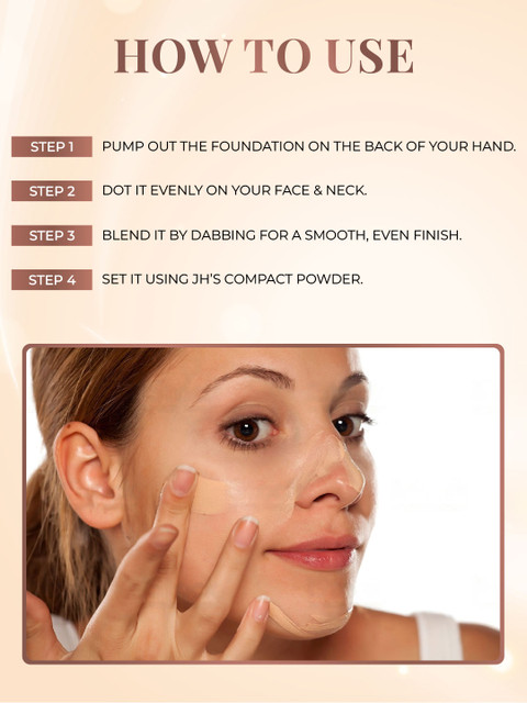 | How-to-Apply | Pump out the foundation on the back of your hand.Dot it evenly on your face and neck.Blend it by dabbing for a smooth, even finish.Set it using JH's Compact Powder. |
