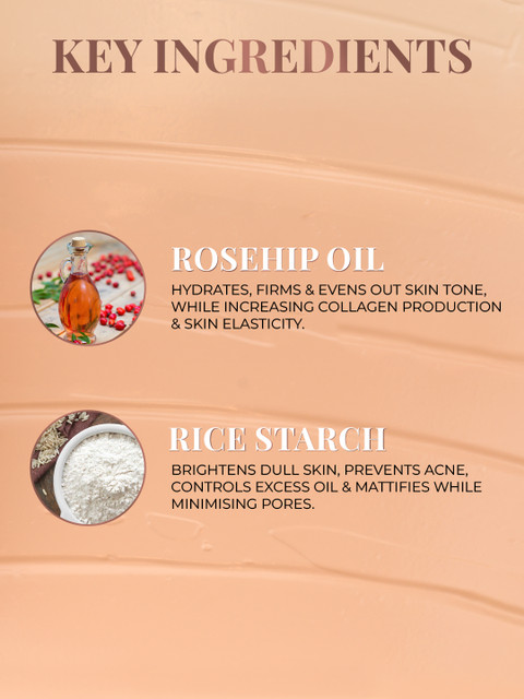 | Ingredients | Key Ingredients:Rosehip Oil – Hydrates, firms and evens out skin tone, while increasing collagen production &, skin elasticityRice Starch – Brightens dull skin, prevents acne, controls excess oil &, mattifies while minimising pores.Full Ingredients List: Mulethi Ext. (Glycirrhyza Glabra), Indian Madder Root (Rubia Cordifolia) Ext., Chandan (Santalum Album) Ext.,vetiver Root (Vetiveria Zizanioidis) Ext., Naagkesar (Mesua Ferrea) Ext., Priangu (Callicarpa Macrophylla) Ext., Cetearyl Olivate, Vegetable Glycerine, Octyldodecanol, Sorbitan Olivate, Cold Pressed Rose Hip (Rosa Moschata) Seed Oil, Cold Pressed Jojoba (Simmondsia Chinensis) Oil, Raal (Shorea Robusta), Mango Butter (Mangifera Indica), Kokum Butter (Garcinia Indica), Rice Starch (Oryza Sativa), Soy L E Cit Hin, Potassium Sorbate E, Gluconolactone, Sodium Gluconate, Ethylhexylglycerin, Zinc Oxide (Ci77947), Titanium Dioxide (Ci77891), Kaolin Clay (Ci77004), Iron Oxides (Ci77491, Ci77492, Ci77499). Certified Organic, Natural Origin (Natural Ingredient From Renewable Resources) |