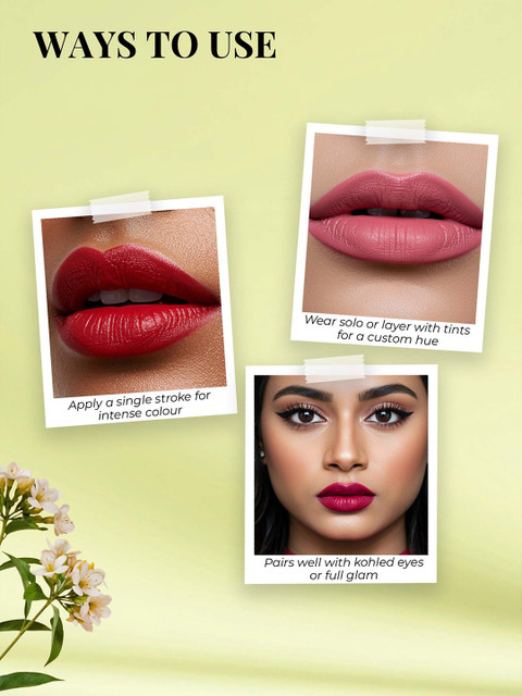 | Benefits | The creamy-matte texture that doesnt budge: The wholesome ingredients infused in our liquid lipsticks formulate a creamy matte texture and sustain the natural moisture of your lips, providing a precise, sleek finish without budging the lipstickNon-drying, non-sticky, non-feathering but long-lasting: Level-up your everyday glam goals with vegan, cushion-soft, weightless matte liquid lipstick that doesnt cause dryness or stickiness. Seamlessly stays &, slays all-day long.Richly pigmented for a single-stroke application: Fall in love with its single stroke, smooth-gliding application that comes with an accessible teardrop applicator. Get luscious, petal-soft lips with a rich, long-lasting colour stay. |