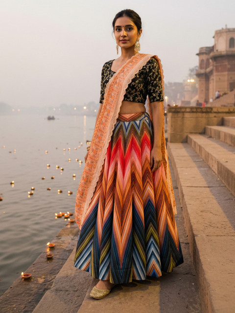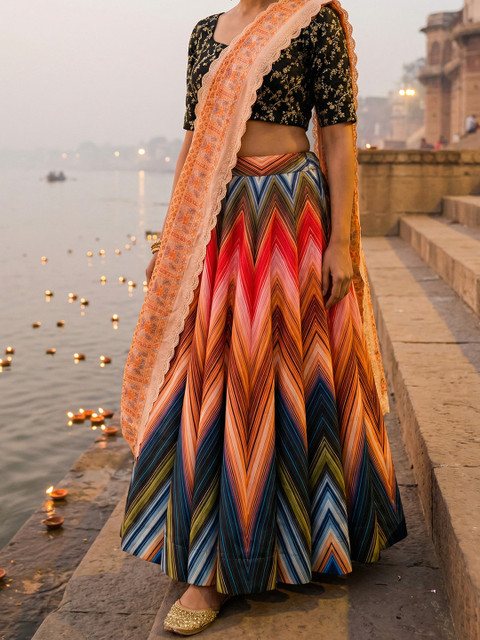 Multicoloured embroidered ready to wear blouse, has a round neck, short sleeves, multicoloured printed ready to wear lehenga, has drawstring closure, flared hem