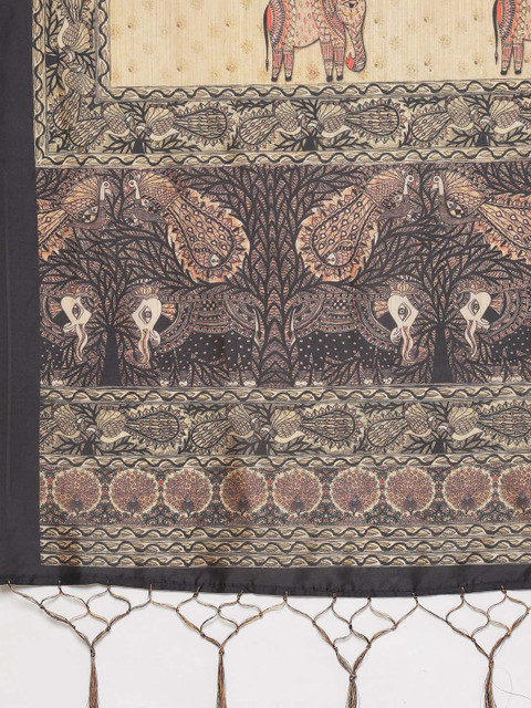 Cream-coloured and maroon, black printed dupatta, tassels border