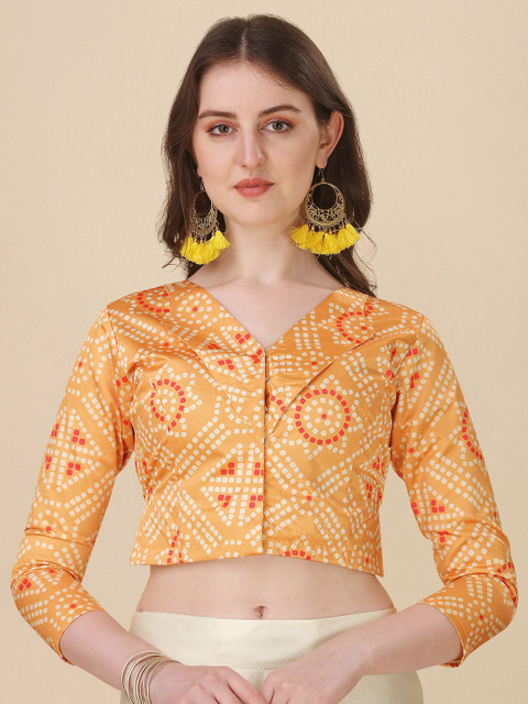Yellow and white, red printed unstitched blouse, has a v-neck, three-quarter sleeves,