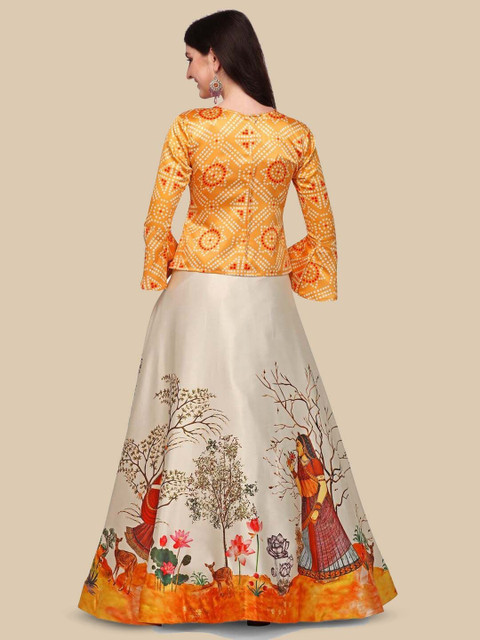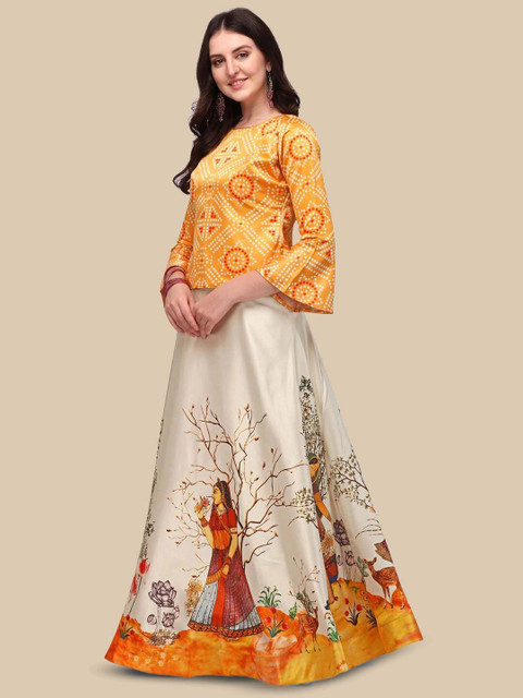 Yellow and white, red printed lehenga choli,