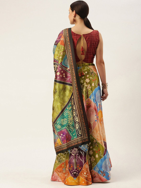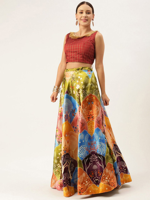 Brown and green & purple printed unstitched blouse, has a round neck, sleeveless, brown and green printed semi-stitched lehenga, flared hem