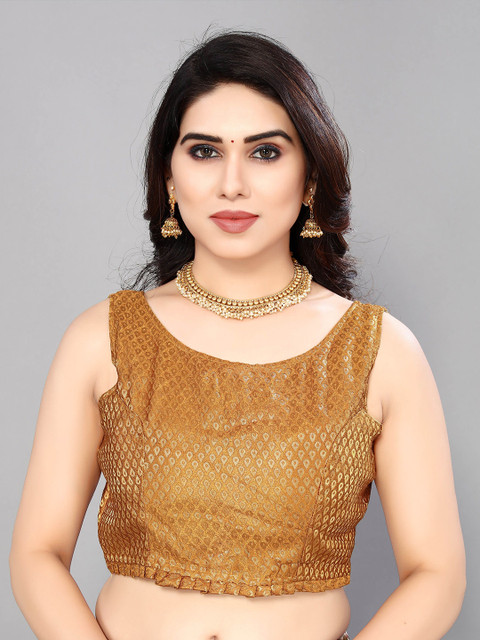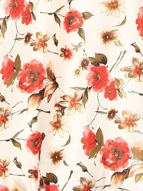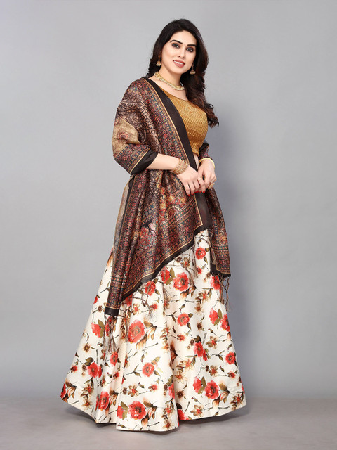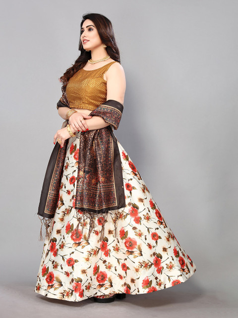 Orange and white woven design unstitched blouse, has a round neck, sleeveless, orange and white printed semi-stitched lehenga, flared hem