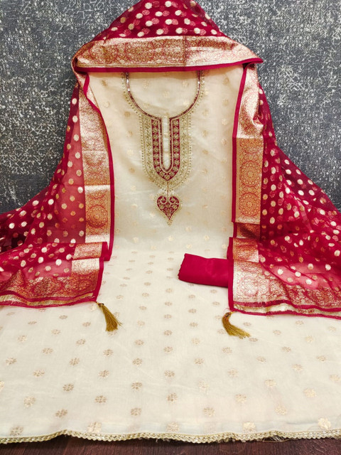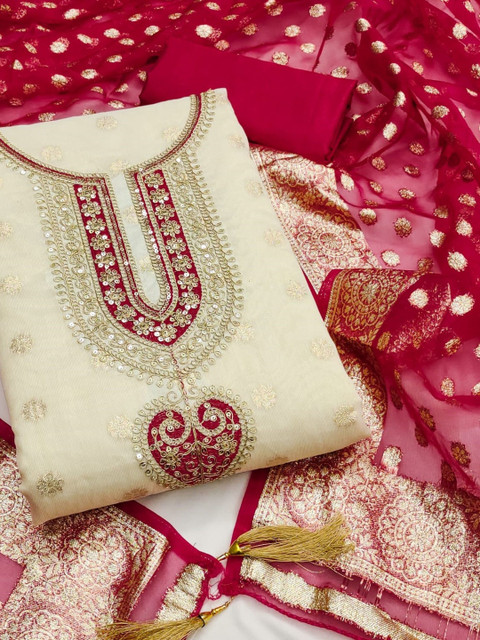 Cream-coloured embroidered unstitched dress material