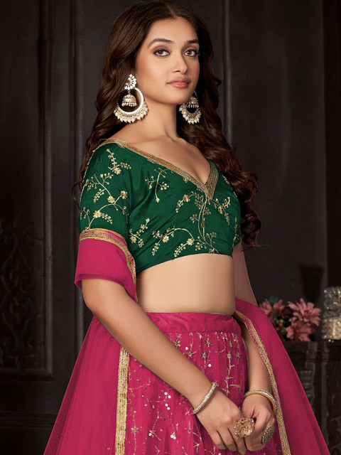 Pink and green embroidered lehenga choli with dupatta, sequinned