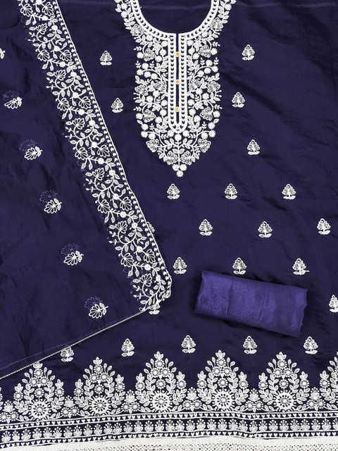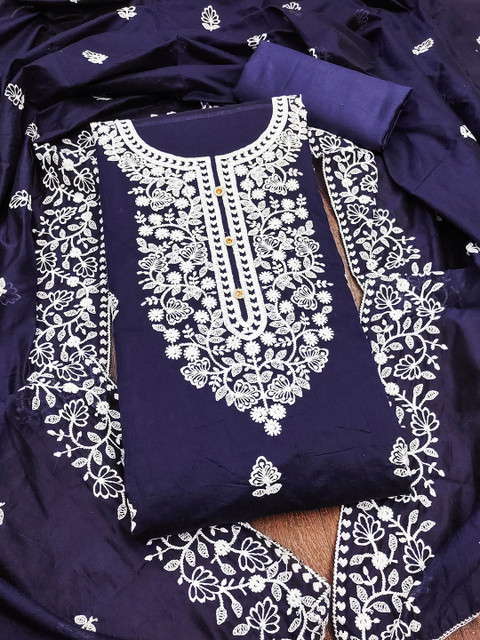 Replenish Your Wardrobe This Unstitched Wrinkle Free Dress Material Set By Kalini Brand. Embroidered Design With Trendy Colors Makes It A Must Have This Season. Crafted With Perfection, This Beautifully Embroidered Set Will Offer You Superb Comfort All Day Long. Top Fabric : Chanderi Cotton. In The Box : 1 Top – 1 Bottom – 1 Dupatta. Wash Care : Home Washable. Color : Blue & Navy Blue. This Unstiched Trendy Chudidar Dress Can Be Used For Festive,Wedding,Office And Casual Wear.