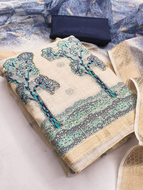 Off white embroidered unstitched dress material