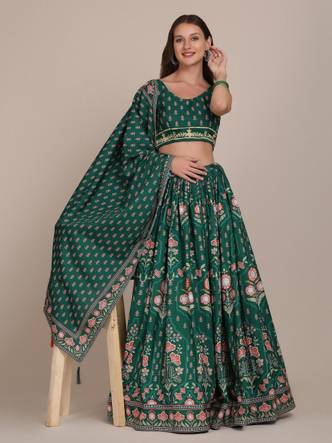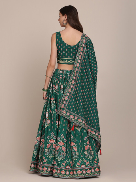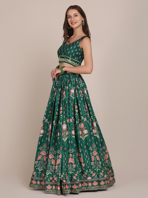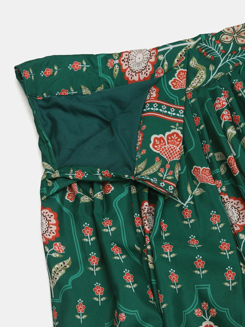 Green and red printed unstitched blouse, has a round neck, short sleeves,