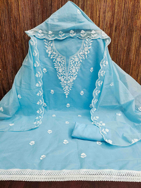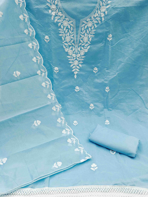 Blue and white embroidered unstitched dress material, has thread work detail