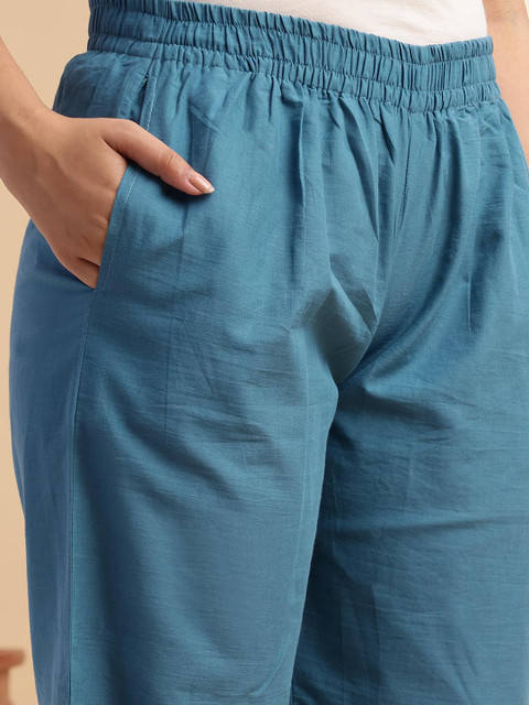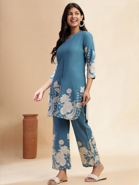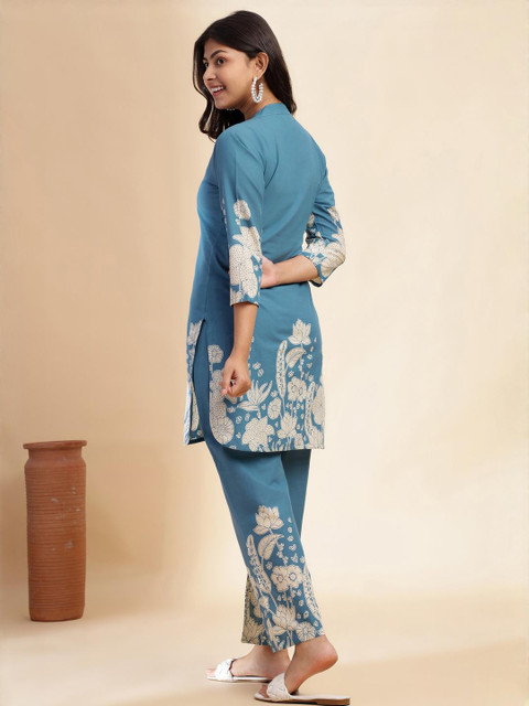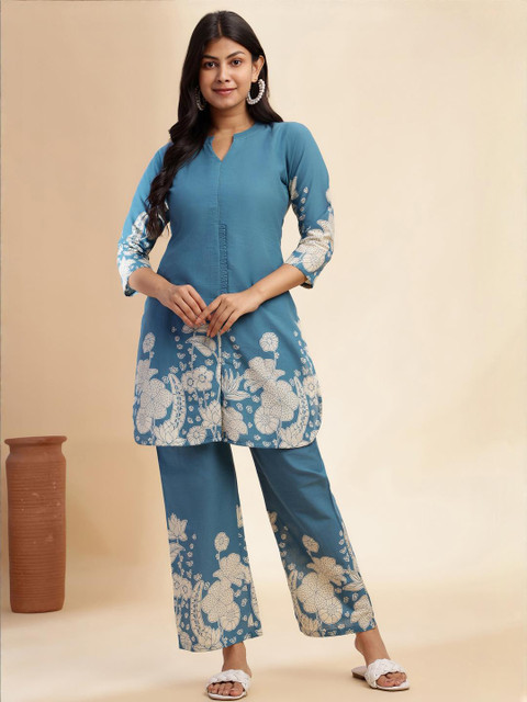 Brighten your ethnic collection with this elegant Aqua Blue straight stitched kurta paired with palazzo pants. Crafted from breathable Cotton, the knee-length kurta features charming floral prints, stylish front and side cuts, and a trendy Mandarin neck. With comfortable 3/4 sleeves and a practical pocket, this outfit offers a perfect blend of style and comfort for casual outings, office wear, or festive occasions. Ideal for women looking for designer kurtas or classic ethnic wear.