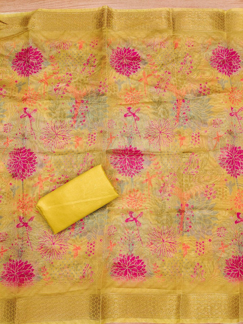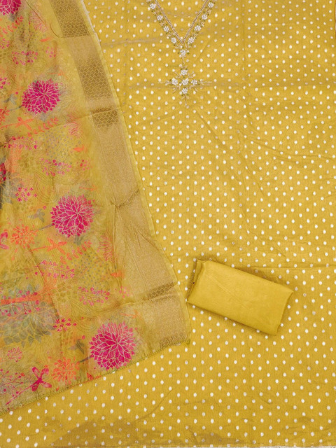 Yellow and gold toned floral woven design beads and stones unstitched dress material