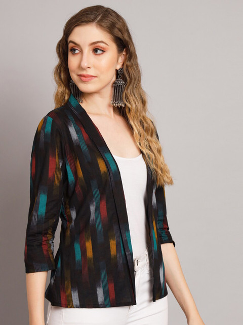 Black and red geometric printed open front regular shrug ,has three-quarter sleeves, straight hem
