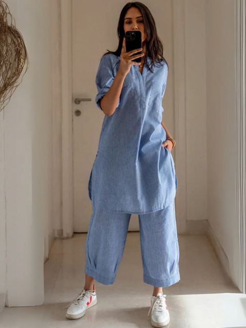 This is a good comfortable Co-ord set. I dropped 1 star because fabric is not pure cotton. Would have given more than 5 stars if it was pure cotton. But comfortable nonetheless and very chic looking…