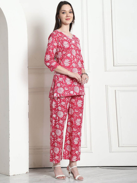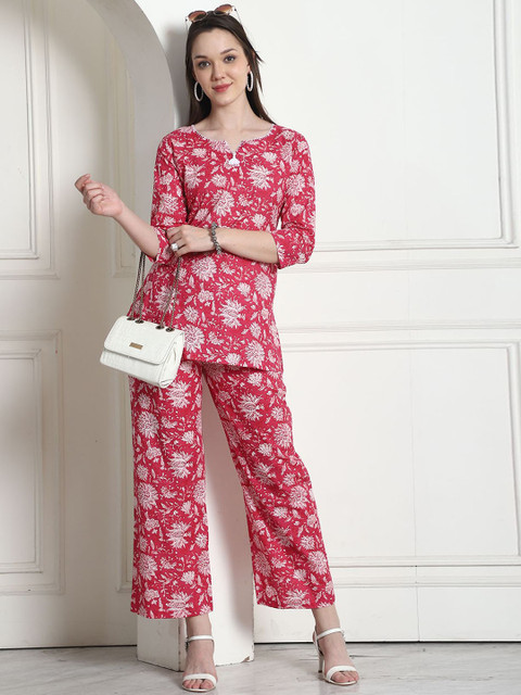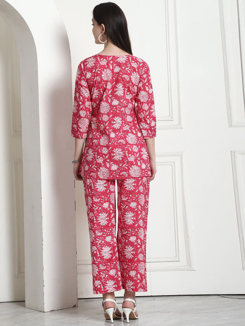 Pink ad white printed top, has three quarter sleeves, slip-on closure and regular waist hem