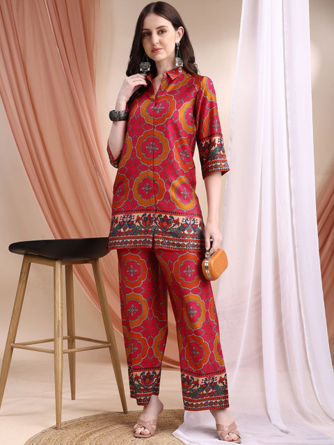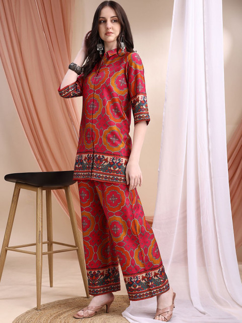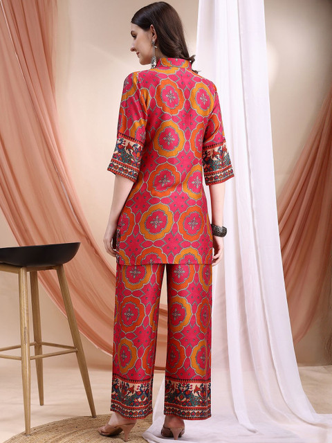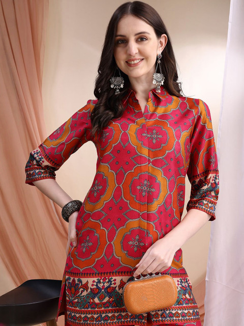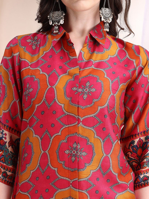 Pink, yellow and white floral print shirt, has a shirt collar neck and three-quarter sleeves, secured with button closure