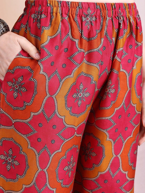 Pink, yellow and white floral print palazzo, has an elasticated waistband with slip-on closure