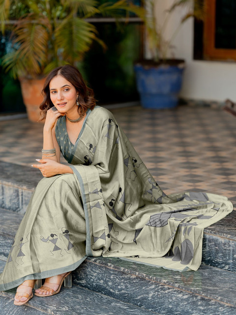 - Olive green block print saree