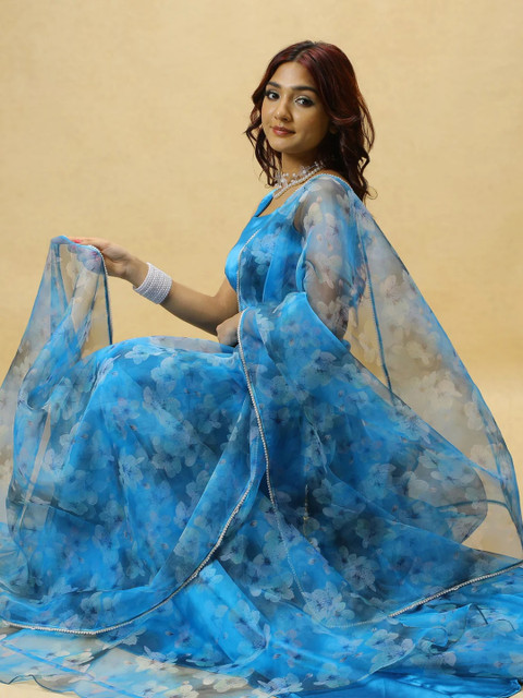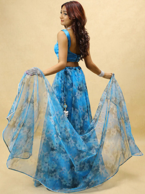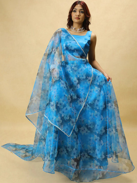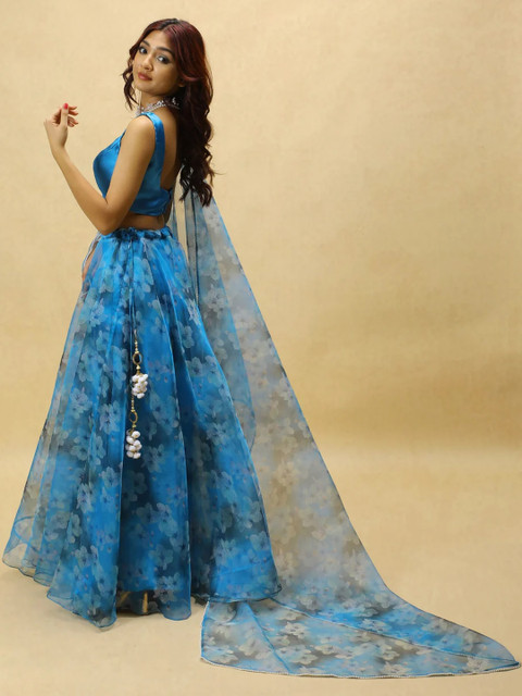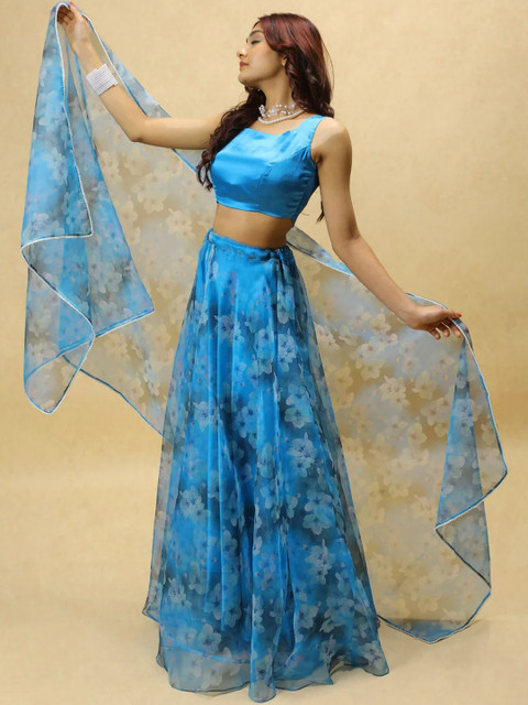Women Blue Floral Printed Semi-Stitched Organza Lehenga Choli