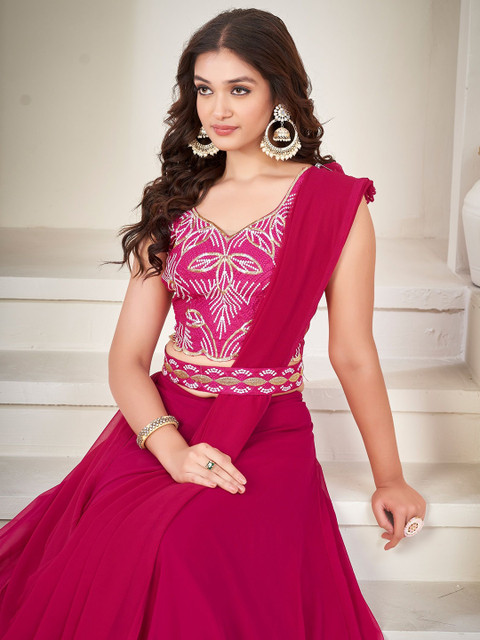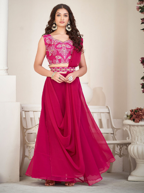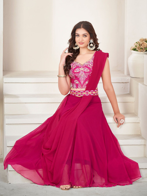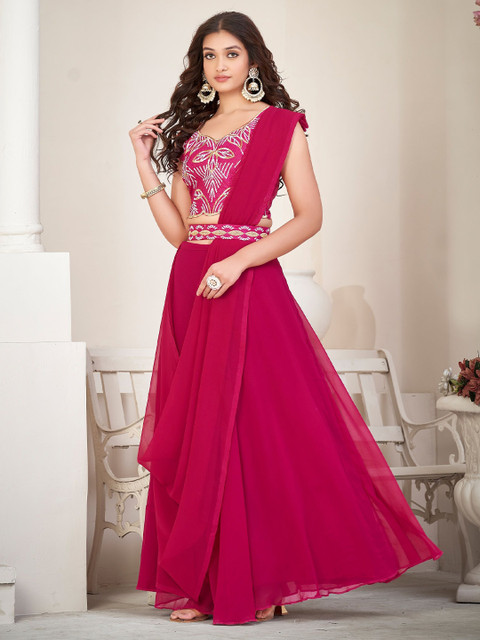 Pink embroidered semi-stitched lehenga, has zip closure, flared hem