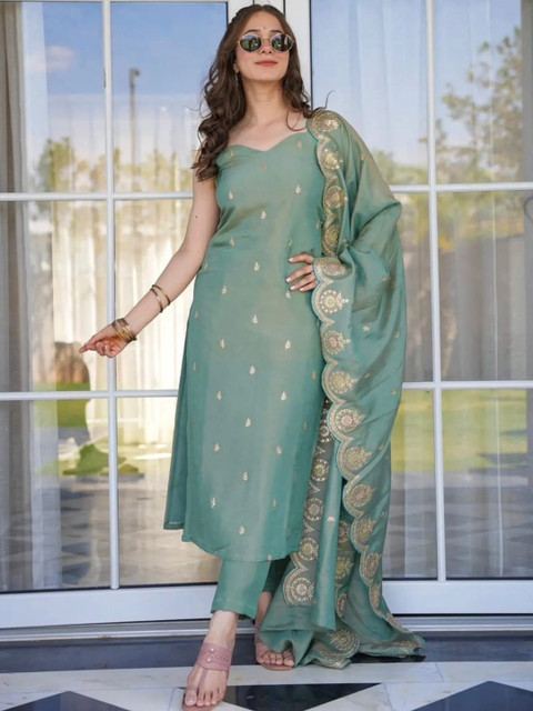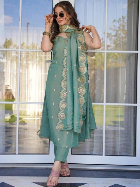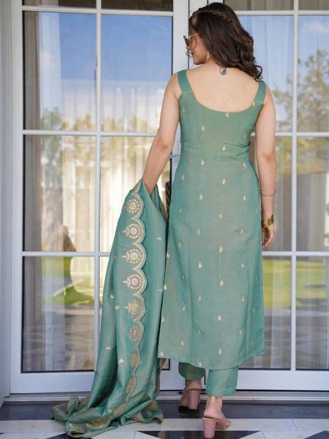 Kurta Fabric: Viscose Zari Chanderi; Bottom Fabric: Viscose Zari Chanderi; Dupatta Fabric: Viscose Zari Chanderi; Dry Clean Only.