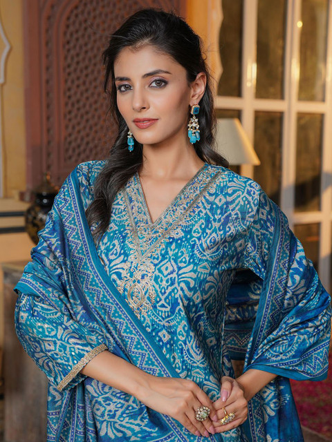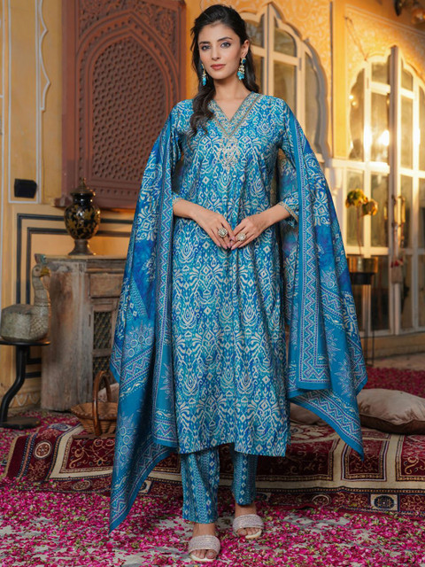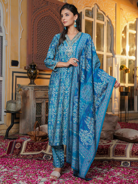 Blue & Beige Printed Kurta with Trousers & Dupatta