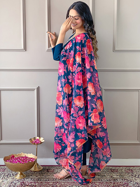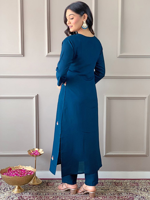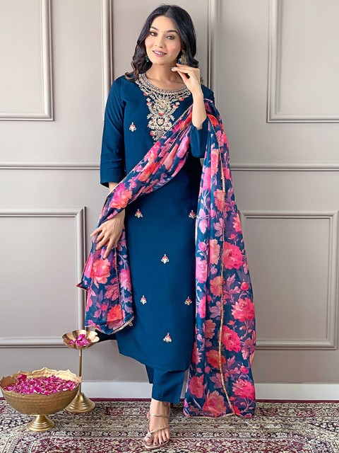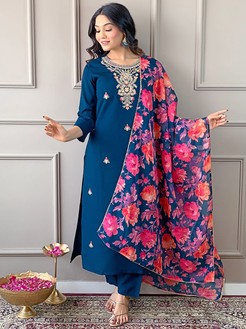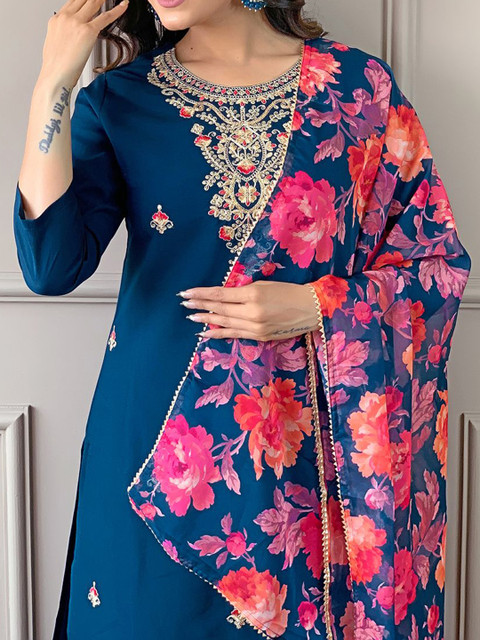 Turquoise blue embroidered Kurta with Trousers with dupatta