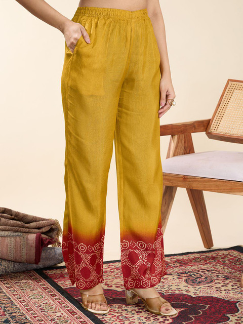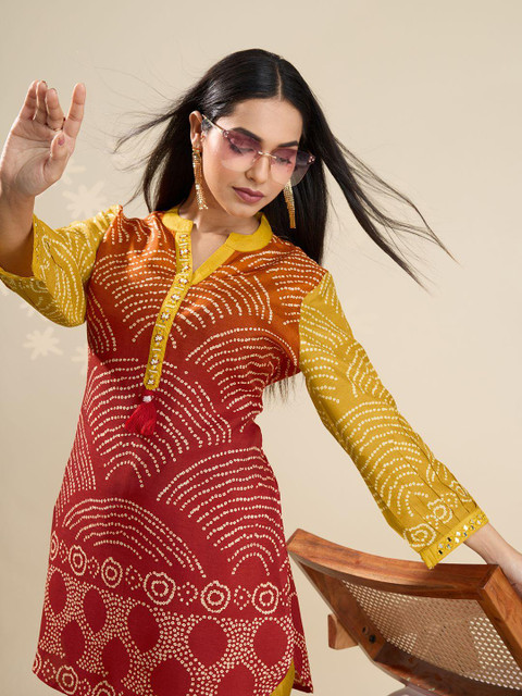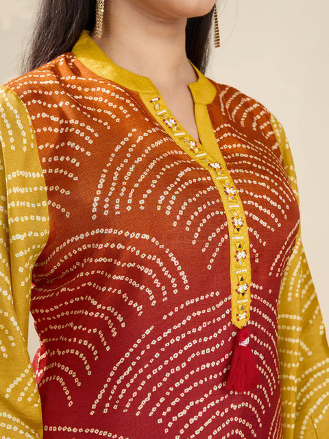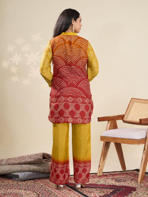 A vibrant two-piece co-ord set featuring a mustard and rust red bandhani-inspired print. The kurta has a mandarin collar with decorative tassels and full sleeves, paired with straight-fit pants that mirror the motif for a cohesive, festive-ready look. Perfect for ethnic occasions with a modern twist.