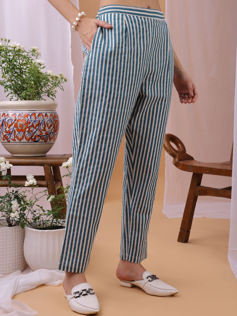 Light-blue striped trousers, has an elasticated waistband with slip-on closure and one pocket, straight Hem
