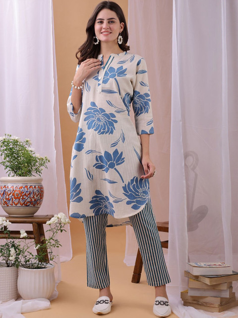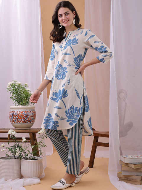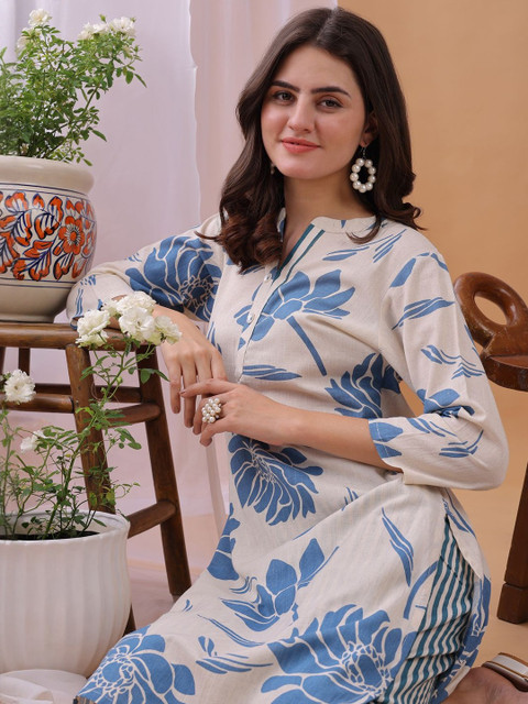 Light-blue floral printed tunic, has a mandarin collar neck and three-quarter sleeves, High-Low hem