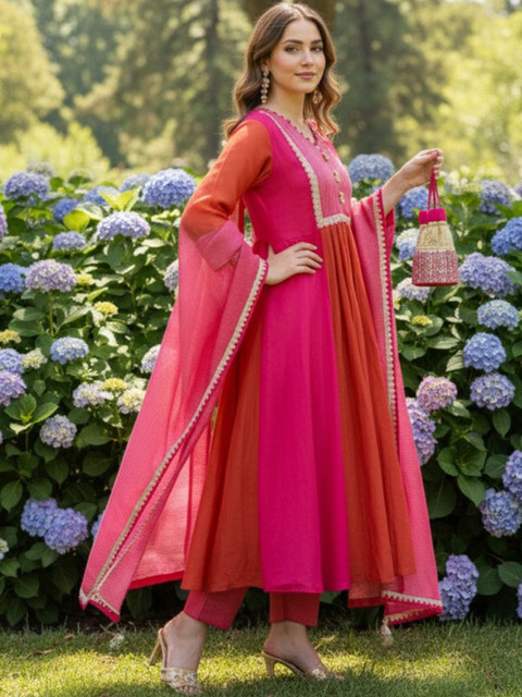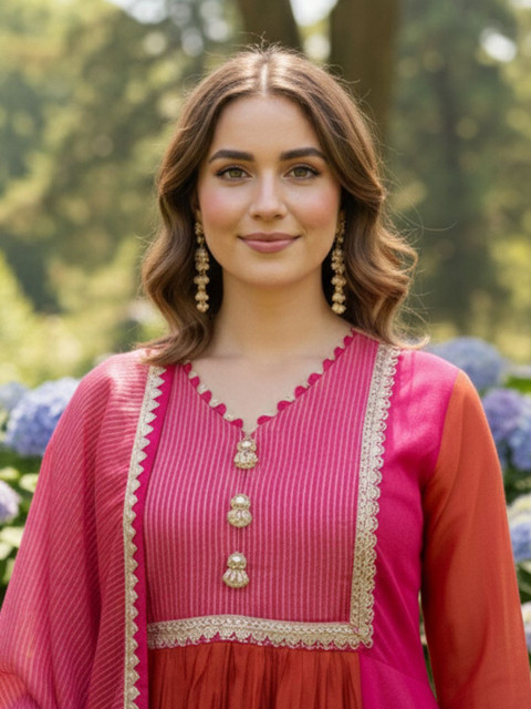 This outfit is vibrant, lively, and full of festive energy. The combination of warm orange and deep pink creates a striking contrast that instantly stands out while still looking elegant. The detailed neckline adds a touch of traditional charm, balancing the bold colors beautifully. The flowy silhouette keeps the look comfortable and flattering, making it perfect for celebrations or daytime festivities. The matching dupatta ties the whole outfit together, adding movement and grace. Overall, it’s a cheerful and stylish ethnic ensemble that reflects confidence, tradition, and modern flair.
