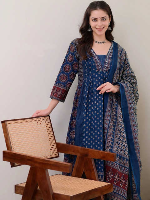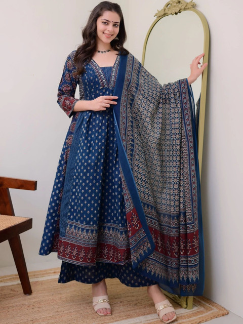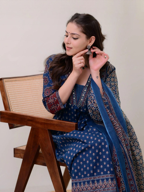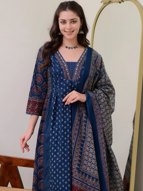 I really liked this dress set (kurta, pant, and dupatta). The dark blue color with the beautiful print looks very elegant, and the fit was just perfect. The fabric quality is great and feels comfortable to wear. What I especially loved is the V-shaped neckline—it gives a stylish look without being uncomfortable, making it look very decent and classy. The overall design gives a light feel and also makes you look a bit slimmer. Totally happy with this purchase