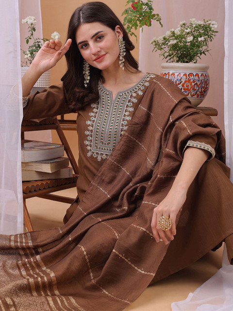 3 reviews for KALINI Yoke Design Sequinned Straight Kurta With Trousers And Dupatta