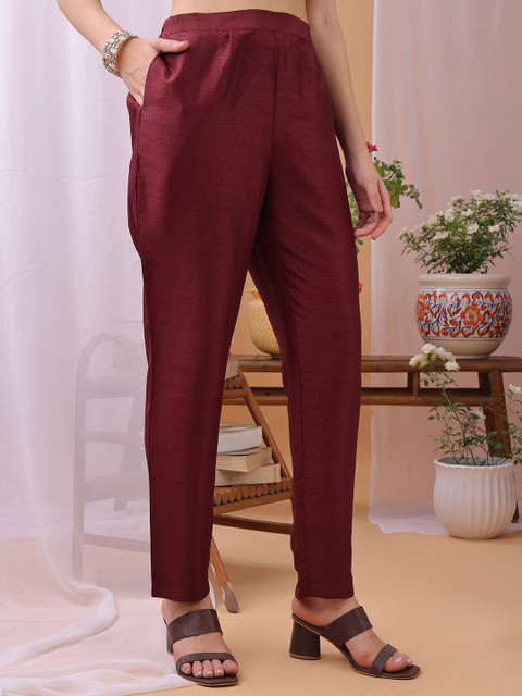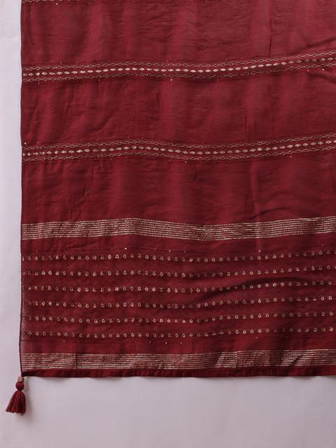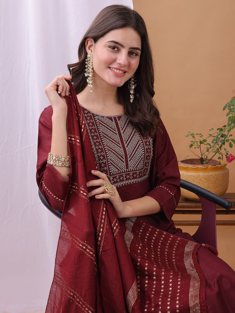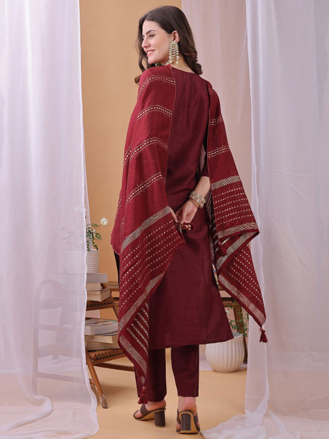 Maroon, gold-toned embroidered kurta with trousers and dupatta