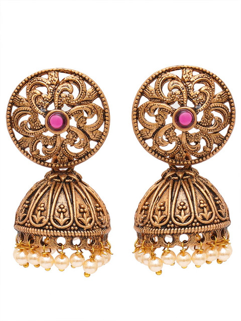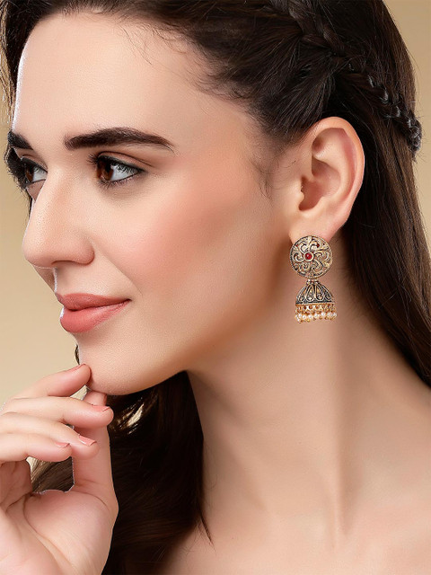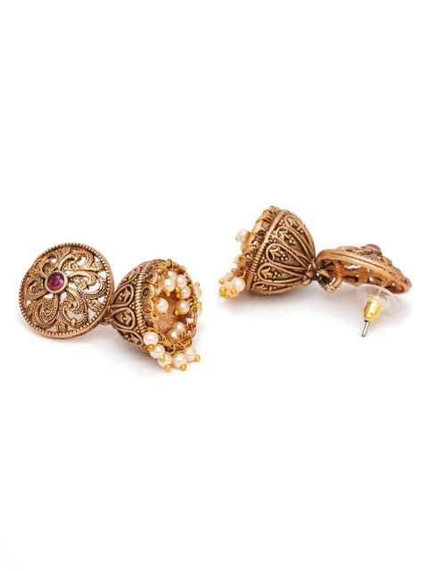 Gold-toned and red classic jhumkas, gold-plated, has kundan