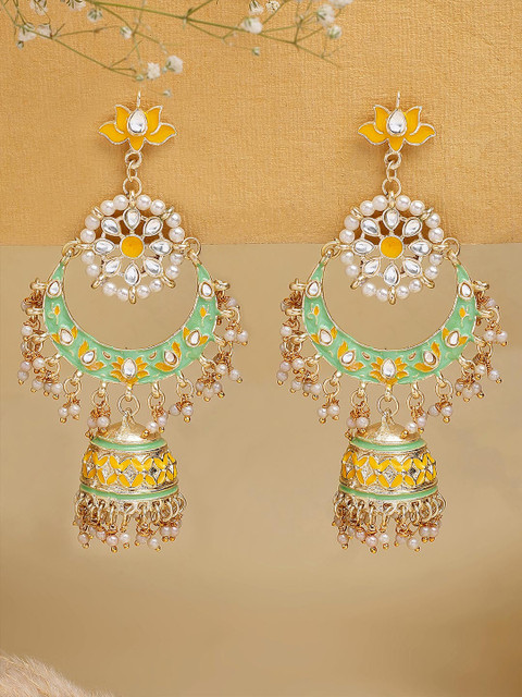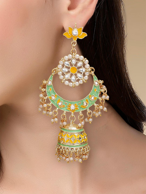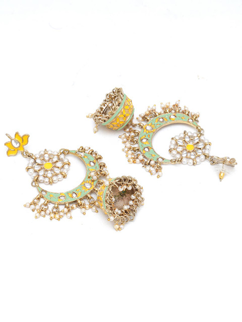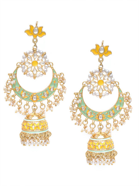 Gold-toned and yellow classic chandbalis, gold-plated, has kundan
